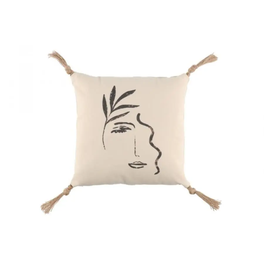 Stylish cushion with abstract face and leaf print and jute tassels. Decorative cushions are a quick and affordable way to give your home a new look and feel. Size 45 x 45 cm. Material 100 % polyester. Hand wash.
