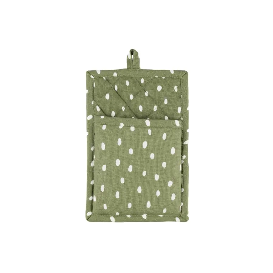 Pot holder with pocket and dot design. Size 16 x 24 cm. Material 100% cotton, filling polyester wadding. Colour green-white. Wash at 30 degrees.