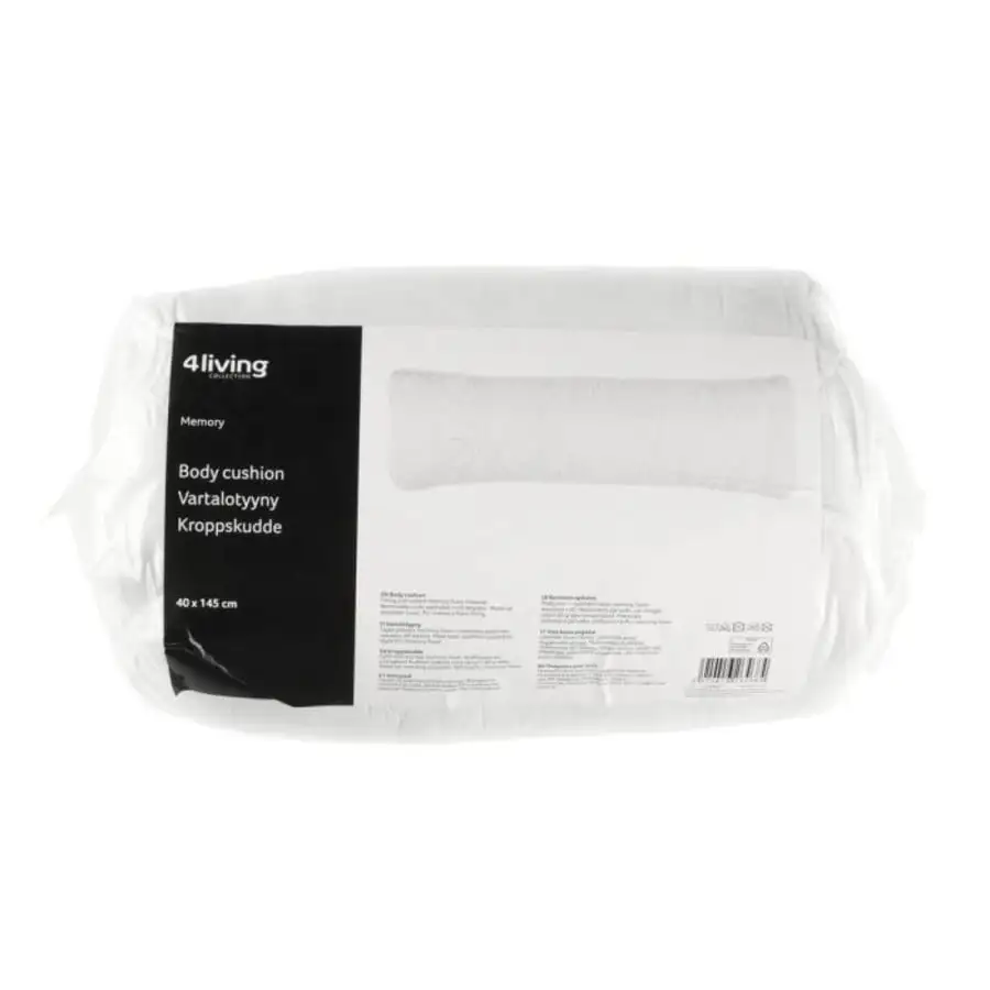 The long shape of the body pillow supports sleeping positions and provides additional support. Also suitable for decorative use, e.g. on a bed. The cover can be easily removed and washed separately at 60 degrees. The filling is made of memory foam material which adapts well to different positions. Packed on a roll, can be re-shaped by fluffing.