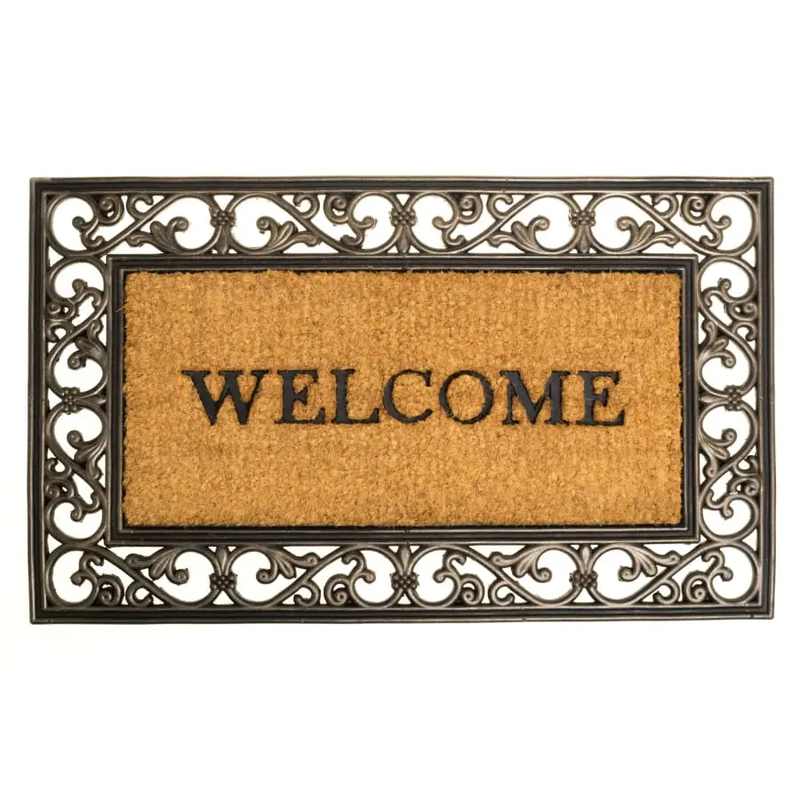 Coconut fiber doormat with Welcome text. The rug is framed with PVC border that looks like wrought iron. The carpet has an anti-slipping base. Thickness 20 mm.
