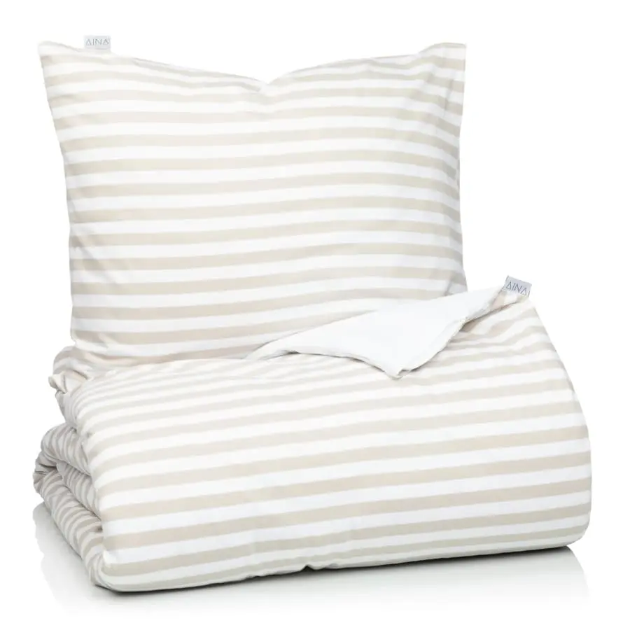 AINA Raita är ett påslakanset med randigt mönster av 100% trikåbomull. Trikåstickan känns mjuk, smidig och varm mot huden.