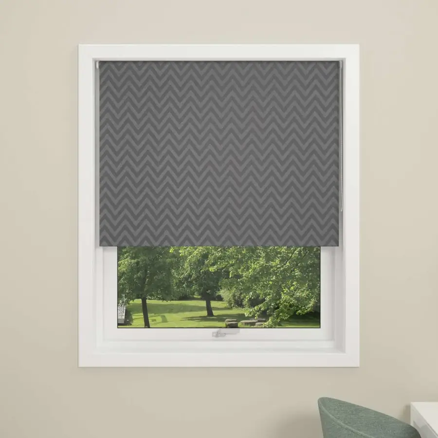 Rullgardin med ett mörkare tyg med trämönster, aluminiumbottenvikt och en plastkedja. De blinda kan fästas på antingen vägg eller tak