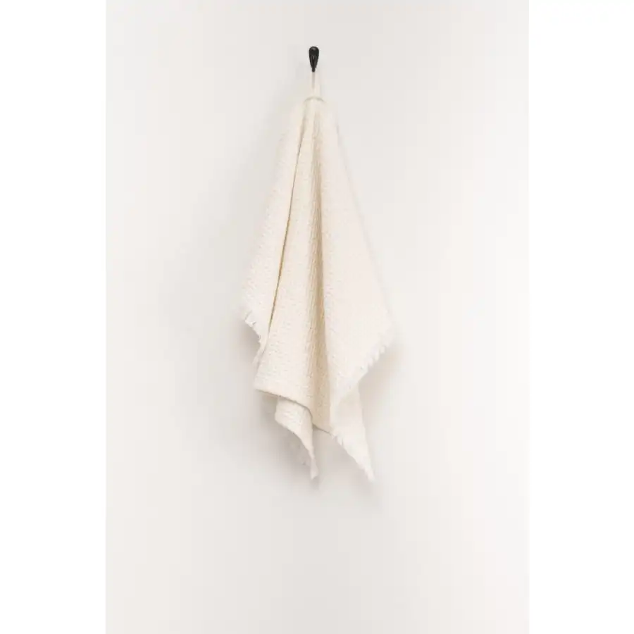 Hand towel of woven honeycomp material. Fringes on shorter sides. Recycled material. Water wash 40 degrees.