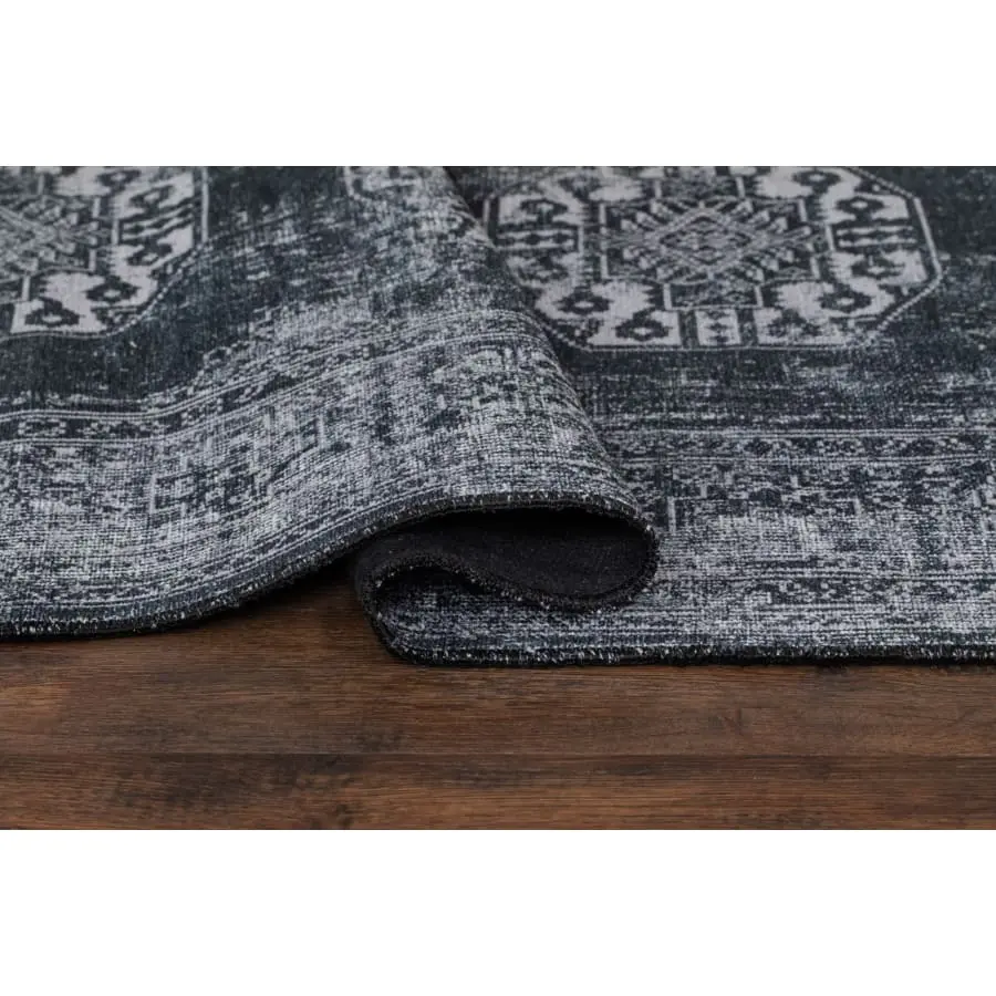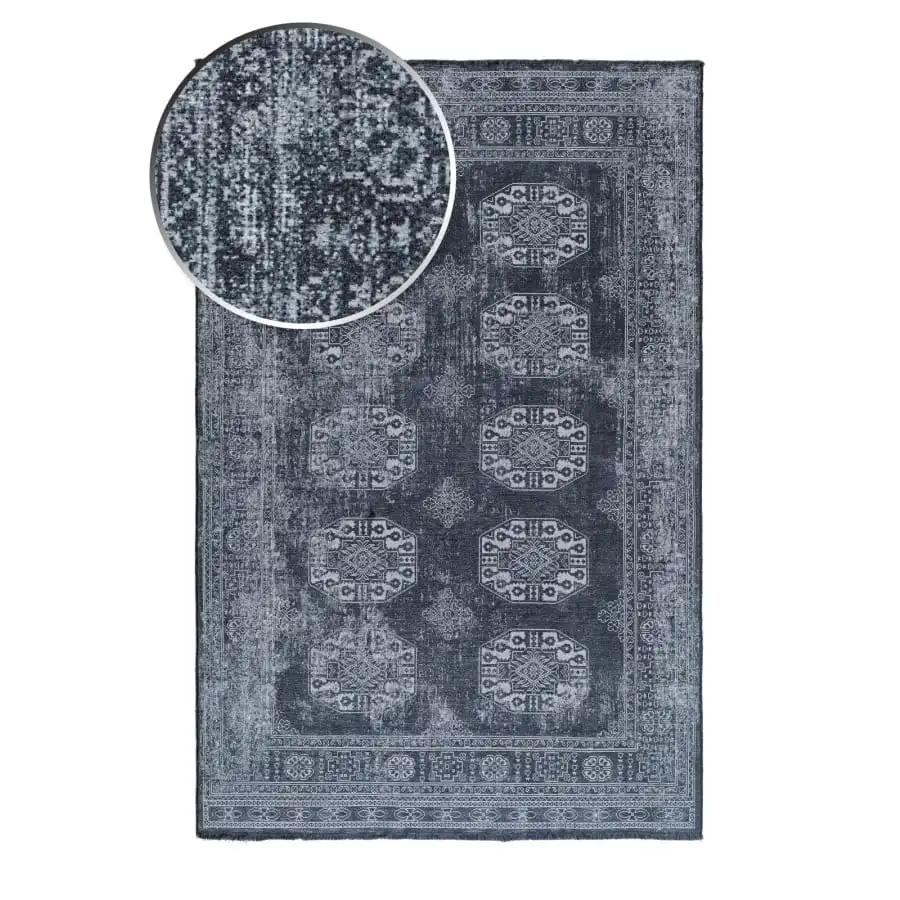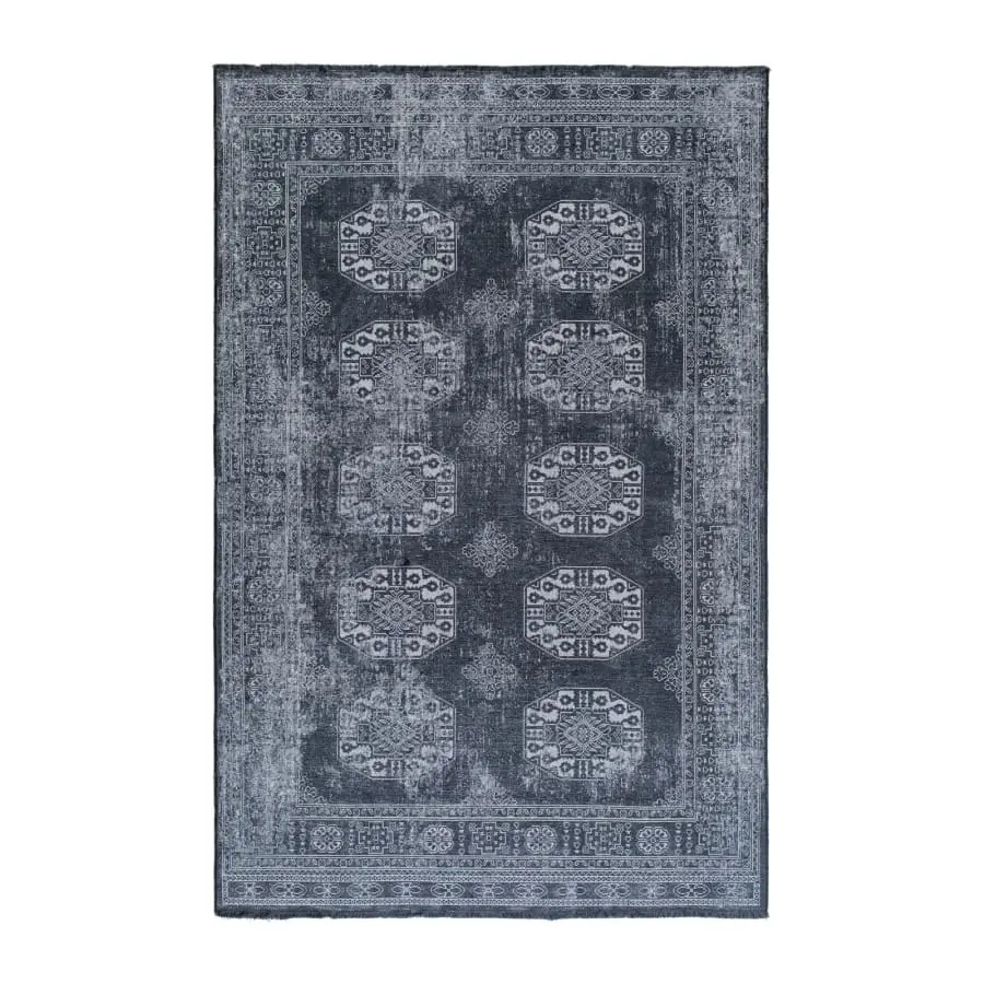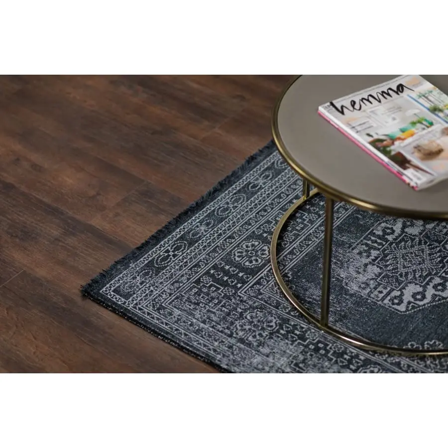 Adana Boccara is a modern printed rug with a bocca pattern printed in charcoal and gray colors. The print has a light vintage look, and the short sides are decorated with black fringes and the long sides are equipped with matching thread. The Adana rug has a felt base and is washable at 30 degrees, so it fits just as well under the dining table as it does in the corner of the TV.
