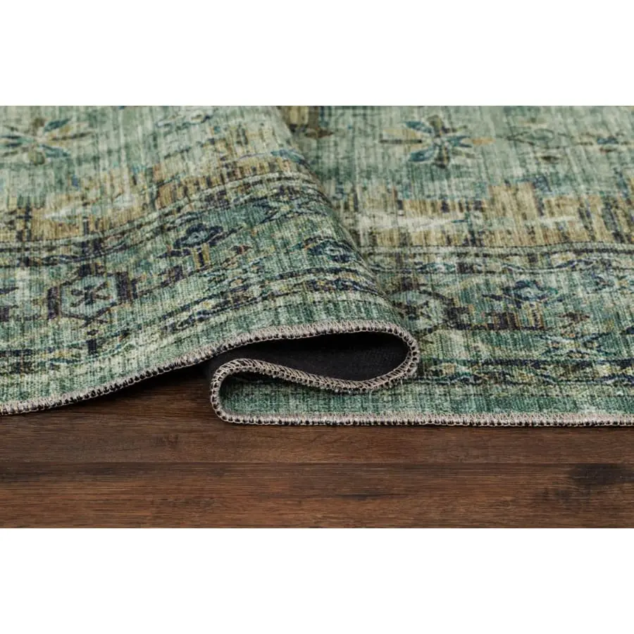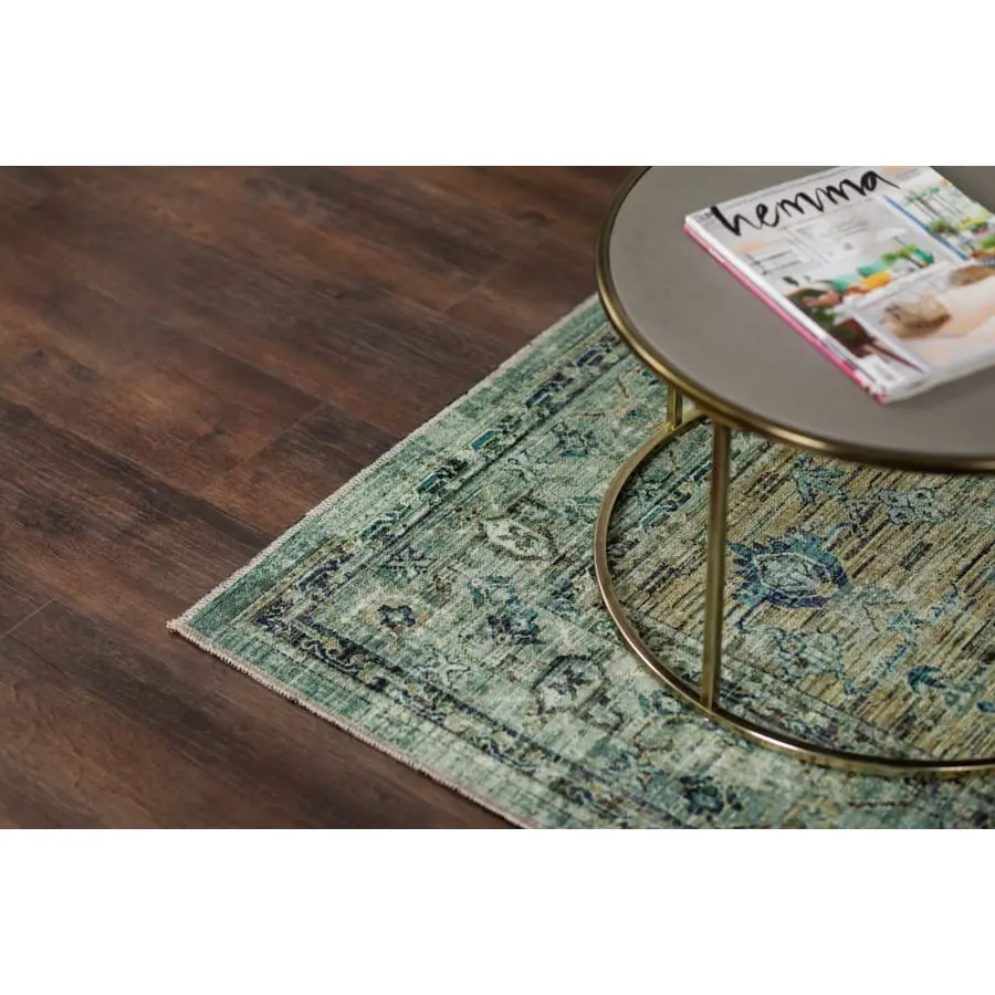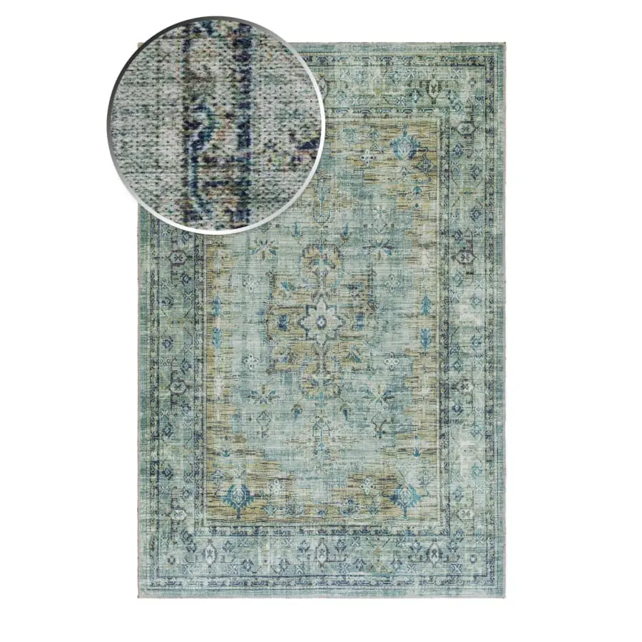 Adana Tabriz Leaf is a printed rug with a classic oriental design and a colorful combination of green, turquoise, blue and sand tones. A rug that brightens up your floor. The print has a slightly vintage look, and the edges are decorated with matching threads. The Adana rug has a felt base and is washable at 30 degrees, so it fits just as well under the dining table as it does in the corner of the TV.