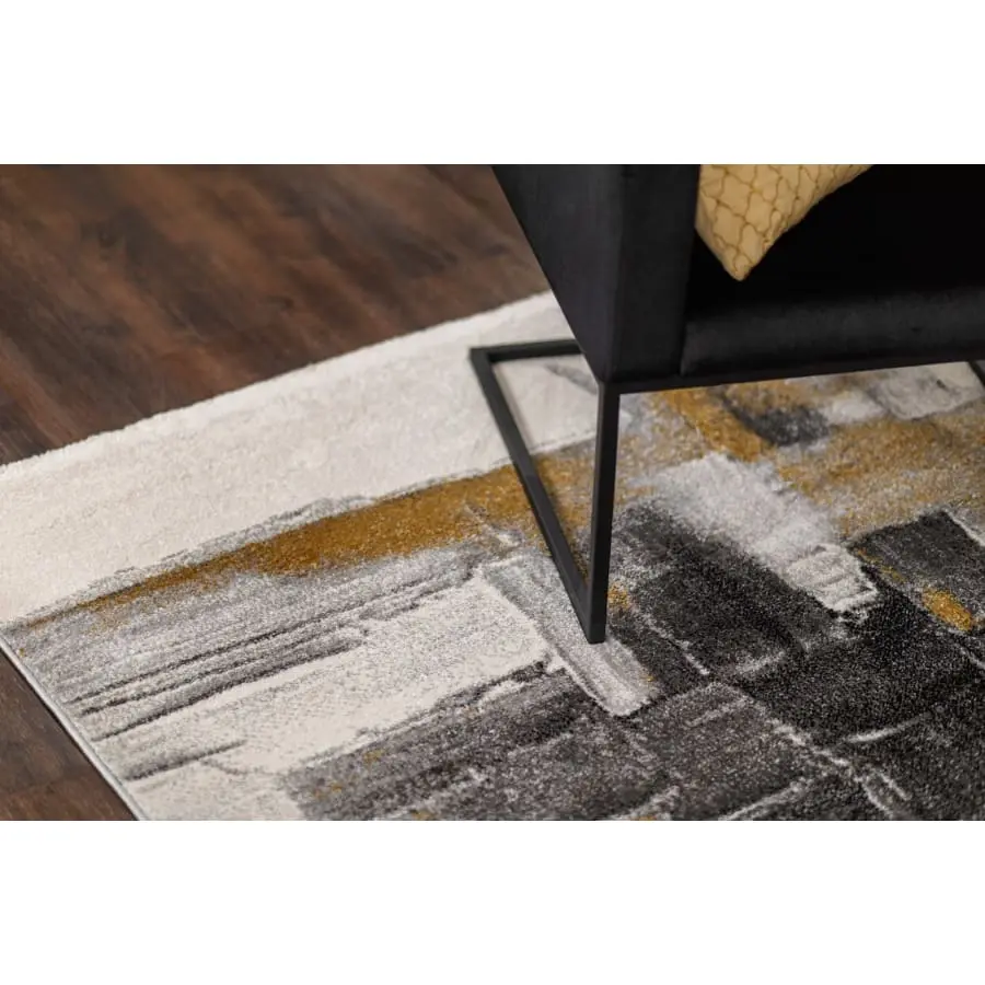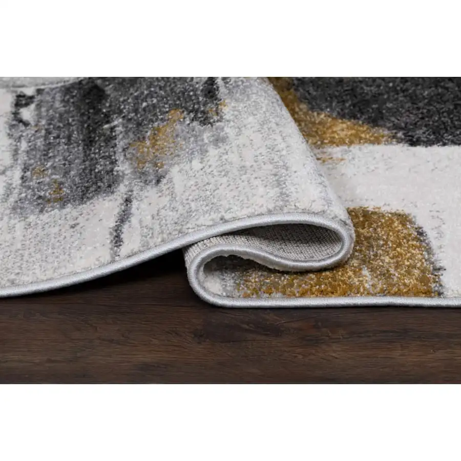Rubin Art is a leisure rug with a nice abstract pattern that resembles a work of art. The rug has a white background and a pattern with different shades of gray and golden accents. The Rubin Art rug has short cut pile and is machine woven from polypropylene, a synthetic material that is easy to clean and keep lint and dust free. Because the carpet has short fibers, dirt cannot penetrate it as easily as a carpet with longer fibers, and it resists most stains well.