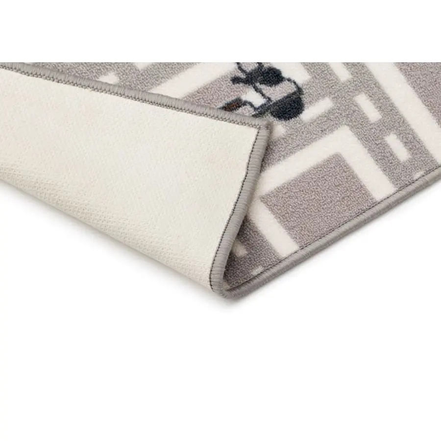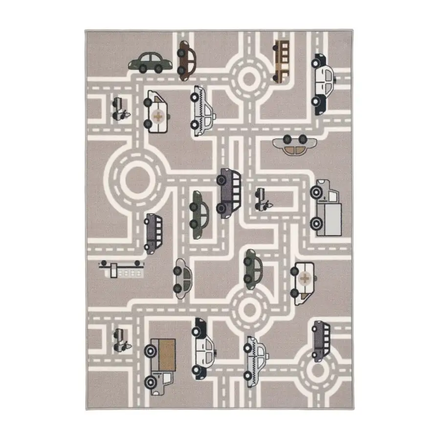 A stylish and playful carpet with a pattern consisting of roads and various vehicles.
