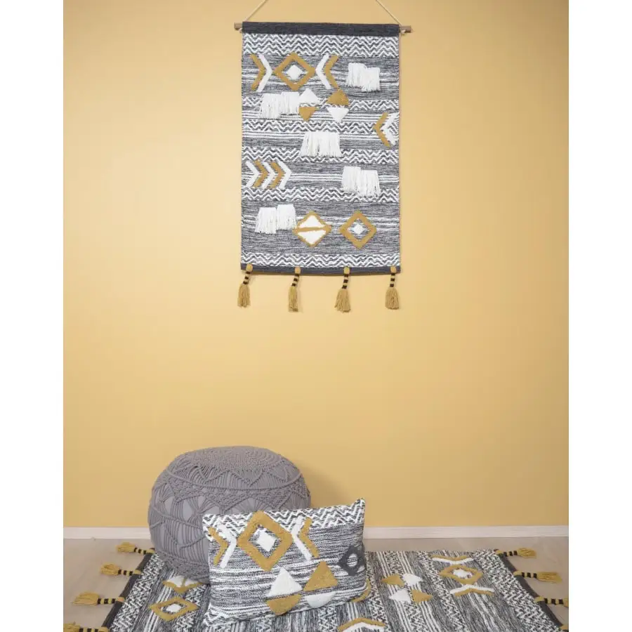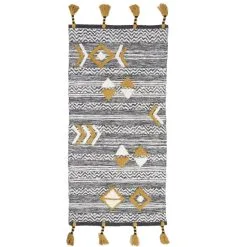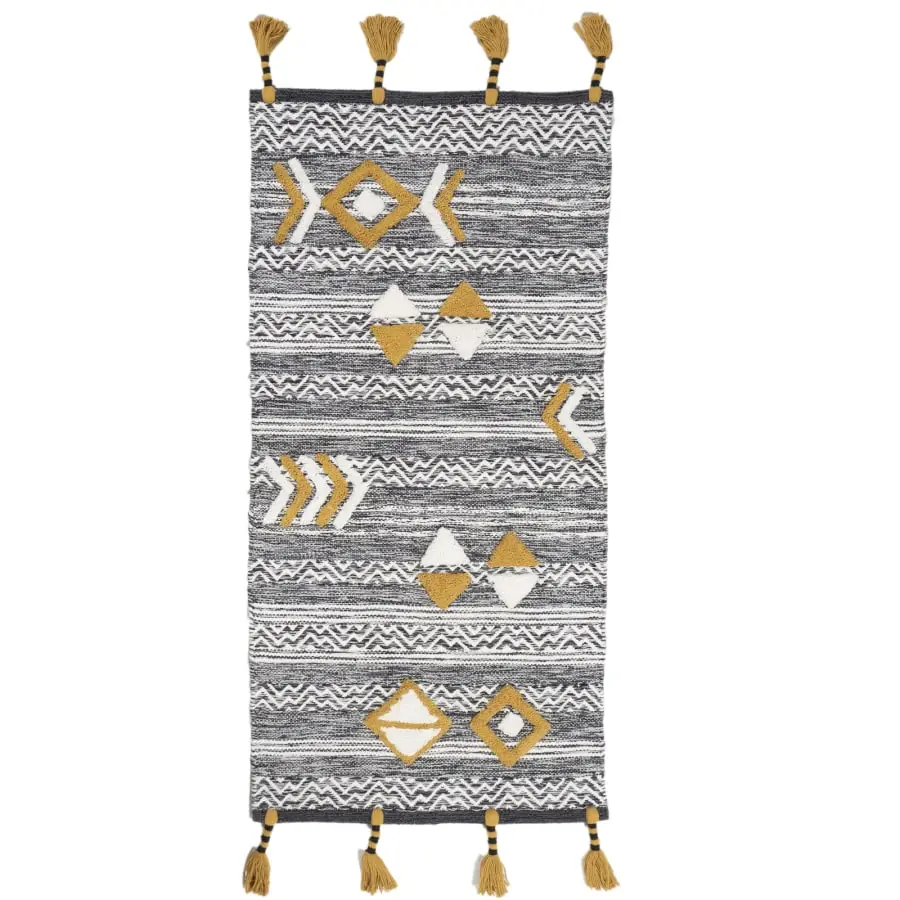 A woven cotton carpet, the surface of which is enlivened by cotton tufted reliefs. The ends of the rug are decorated with beautifully knotted fringes. Material 100% cotton. The treatment is regular vacuuming and ventilation. If necessary, wash in plain water max 30 degrees. No hanging around the ends of the carpet.