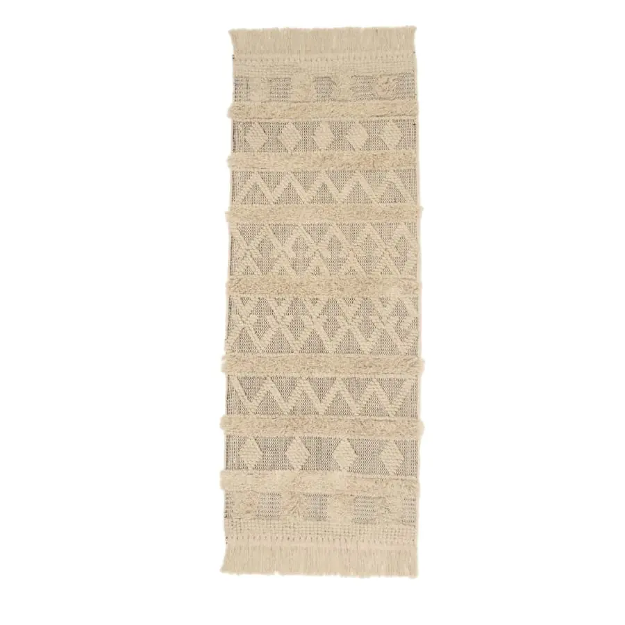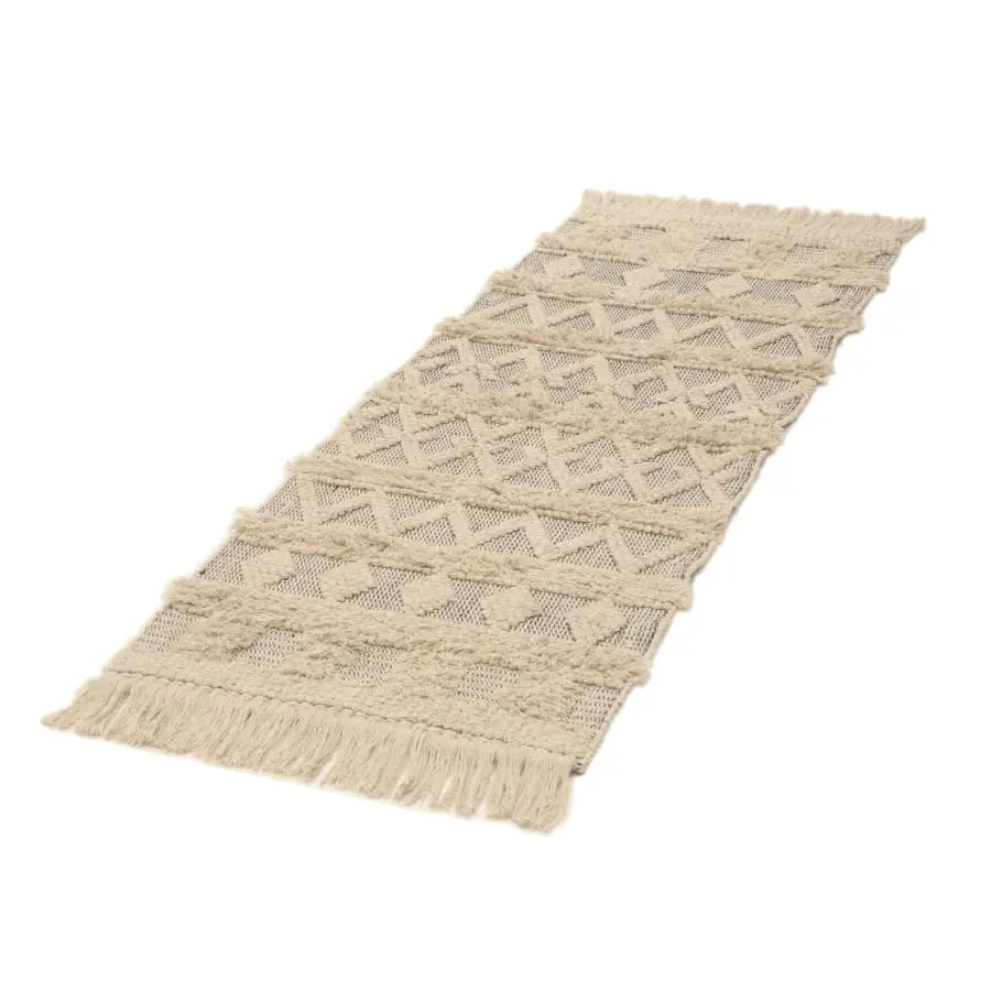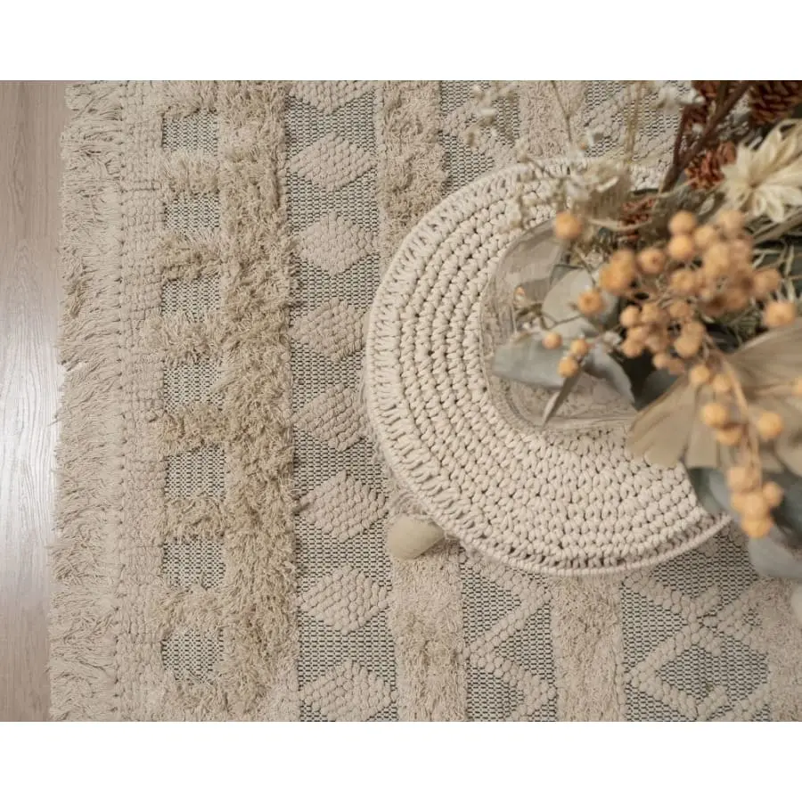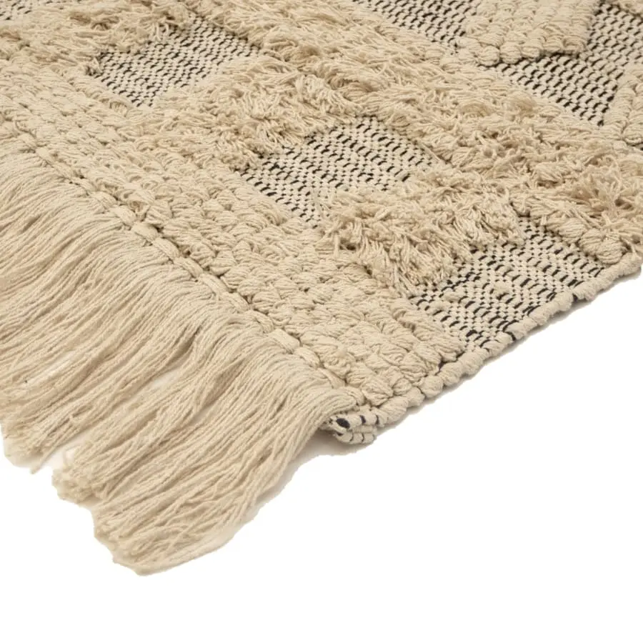 Solina is a linen-colored cotton rug for bohemian decorators. The fringes and tassels create a surface pattern on the rug and the rug has beautiful long fringes at the ends.