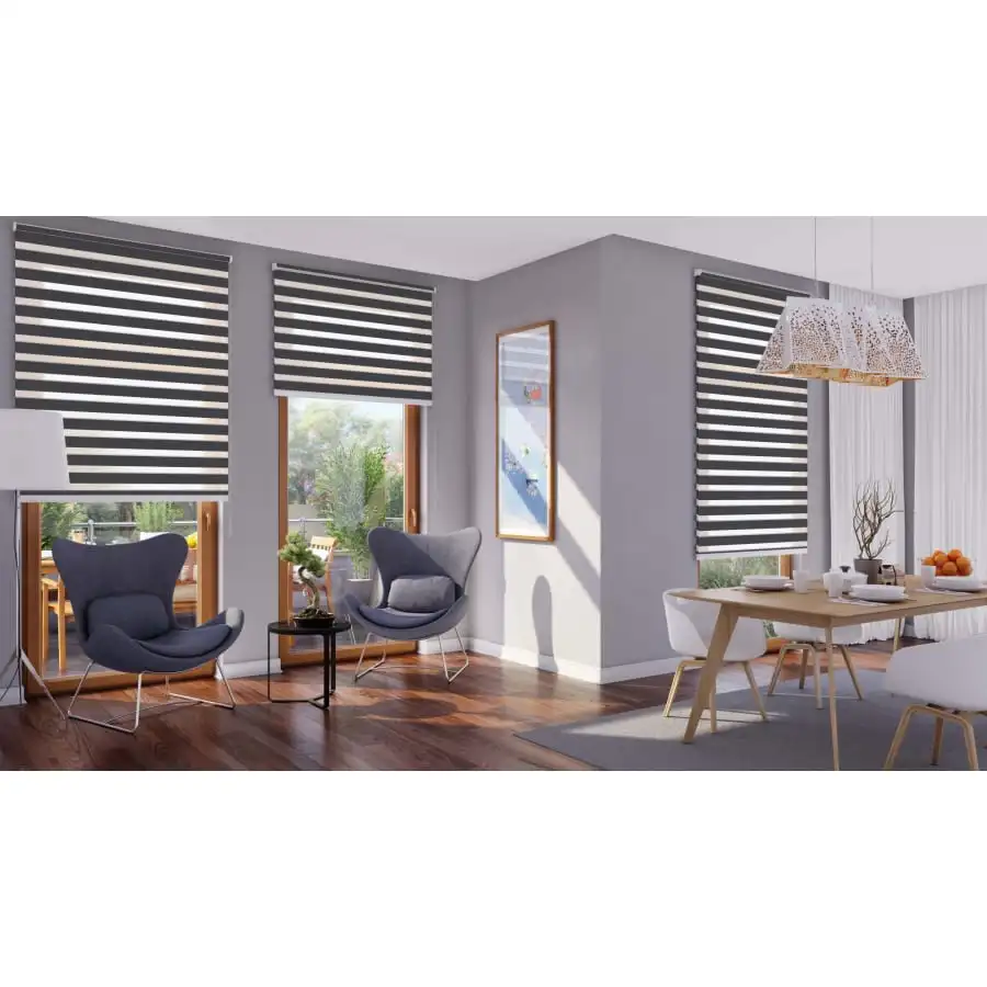 Mönstren på Day & Night persienner har omväxlande transparenta och färgade remsor i horisontell riktning. Det översta tyget kan flyttas i förhållande till det nedre och på så sätt anpassa mängden ljus som kommer igenom och det visuella utseendet. Ett ljustät lager är invävt i färgremsan. Med den droppformade bottenremsan rör sig tyglagren väldigt nära varandra, så att ljus inte kommer in mellan tygerna och persiennen blir nästan helt mörklagd. Som standard har persiennen en vit Presto* – sidojusteringsmekanism och bottenlist.