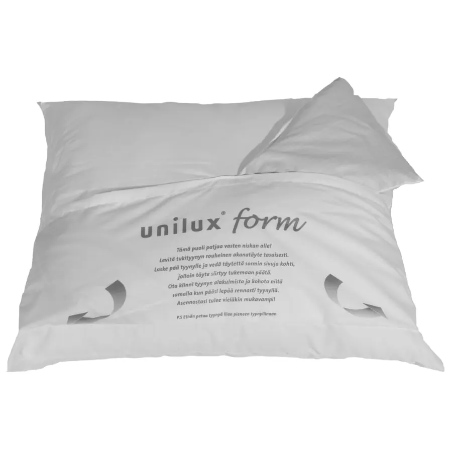 Den ergonomiska kudden Uni-Medical Form är resultatet av ett samarbete mellan Univisio, nackpatienter och fysioterapeuter. Den är idealisk för den som lider av smärta i huvud och axelparti och kan även bidra till att lindra migrän. Kudden har fast struktur och normal höjd och är lämplig för den som sover på rygg eller på sidan. Kudden ger nacke och skuldror rätt stöd och låter huvudet vila i ett avslappnat läge. På kuddens ena sida finns en ficka avsedd för den medföljande stödkudden som innehåller 270 g boveteskal. Kudden vänds så att fickan med stödkudden vilar mot madrassen och ger din nacke stöd. Samtidigt får du njuta av den luftiga mjukheten hos Blowfill®-bollfiberfyllningen i polyester (400 g). Det går bra att tvätta kudden i 60 grader om du först avlägsnar stödkudden (den tvättas vid behov för hand). Kudden Uni-Medical Form ska fluffas upp regelbundet.