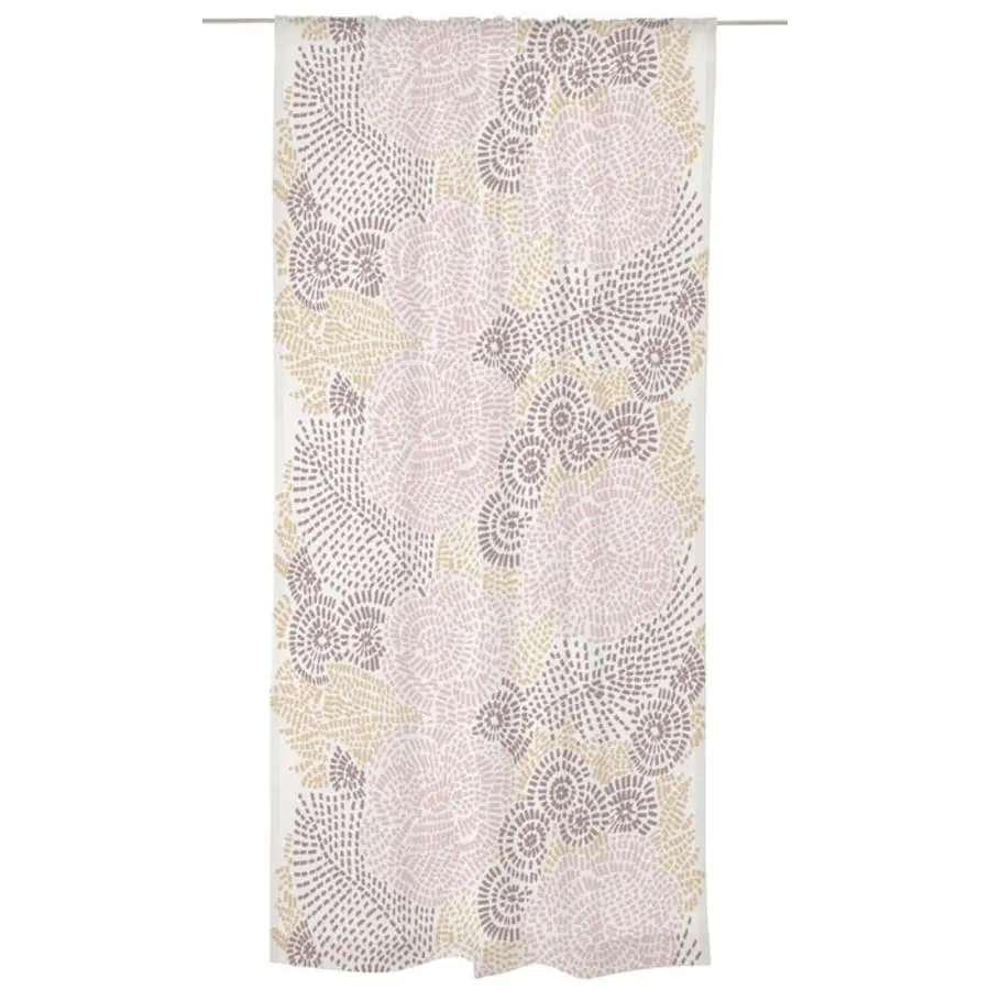 The Kirjo pattern is inspired by traditional crafts and embroidery. The drawing pattern imitates stitches and forms a stylized flower arrangement. Individually packed ready-made curtain, shirring strip and rod hole at the top edge.