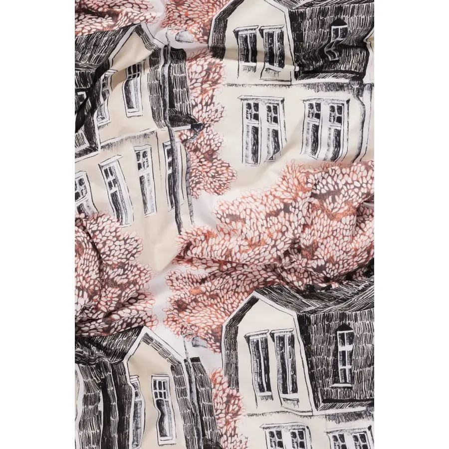 Puukylä-kuosi on Riina Kuikan suunnittelema ja idea kuosiin on lähtenyt Puu-Vallilasta ja siellä olevista kauniista mansardikattoisista taloista.