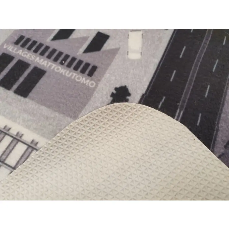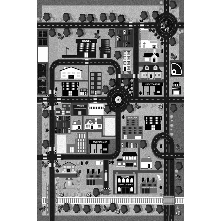 Stadsbarnsmatta för även tuffa spel. Mattan har en mjuk yta som är skön att leka på. Den halkfria basen håller mattan väl på plats. Trendig svart och grå färg. Mattan har många fina detaljer och texter på finska.